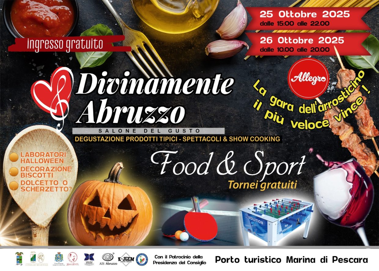(Pescara – 24 ottobre 2025) – Sabato 25 e domenica 26 ottobre torna al Pala Becci del Porto Turistico Marina di Pescara “Divinamente Abruzzo – Food & Sport”, il Salone del Gusto giunto alla sua terza edizione. L’evento, a ingresso gratuito, è dedicato alla valorizzazione dei sapori, delle tradizioni e dello sport abruzzese, con un programma pensato per coinvolgere famiglie, giovani e turisti.