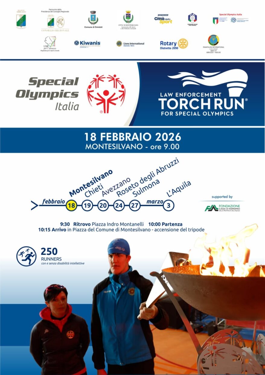 Montesilvano si prepara a diventare il primo palcoscenico abruzzese del Torch Run Special Olympics 2026, la corsa della fiaccola che accompagnerà l’avvicinamento alla XXXVII edizione dei Giochi Nazionali Invernali, in programma a Ovindoli dal 2 al 6 marzo. Domani, 18 febbraio, la città accoglierà l’avvio ufficiale del percorso regionale, trasformando le sue strade in un simbolico corridoio di luce, sport e inclusione.