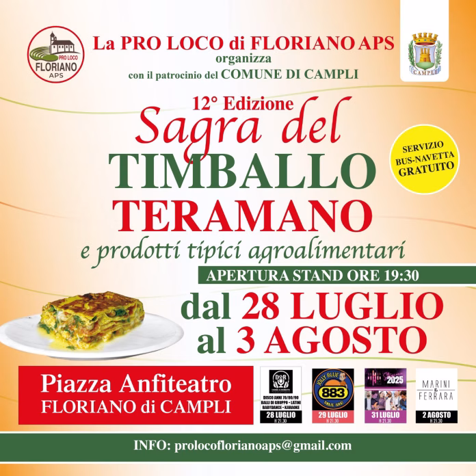Floriano di Campli (TE) – Dal 28 luglio al 3 agosto, Piazza dell’Anfiteatro si trasforma in un palcoscenico di sapori, cultura e festa per la Sagra del Timballo Teramano e dei prodotti tipici agroalimentari, uno degli appuntamenti più attesi dell’estate teramana.