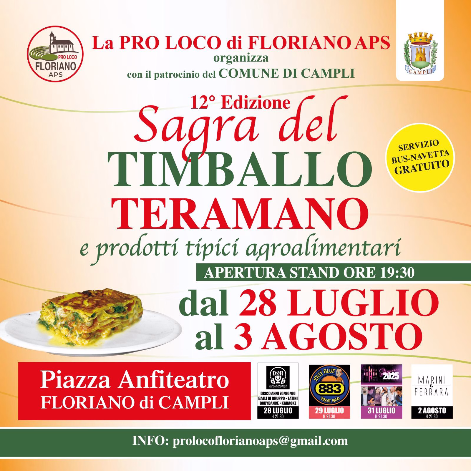 Organizzata dalla Pro Loco di Floriano in collaborazione con il Comune di Campli, la manifestazione rende omaggio al timballo teramano, piatto simbolo della tradizione locale, composto da strati di scrippelle e pallottine che regalano un gusto inconfondibile. Il prestigioso riconoscimento ottenuto con l’inserimento nel libro Sagre d’Italia di Slow Food Editore ne certifica il valore culturale e gastronomico.
