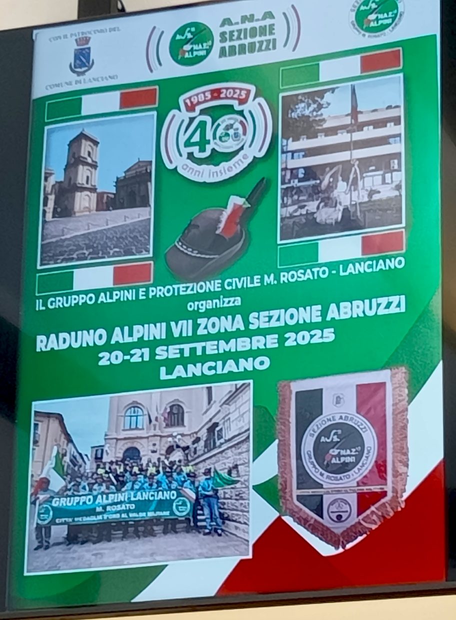 LANCIANO – Il 20 e 21 settembre la città di Lanciano ospiterà il Raduno degli Alpini della VII Zona della Sezione Abruzzi, un evento atteso e sentito che torna dopo vent’anni, a coronamento delle Feste di Settembre. La manifestazione, organizzata con il patrocinio del Comune, celebra anche il quarantesimo anniversario della fondazione della sezione locale “Maurizio Rosato”, nata nel 1985.