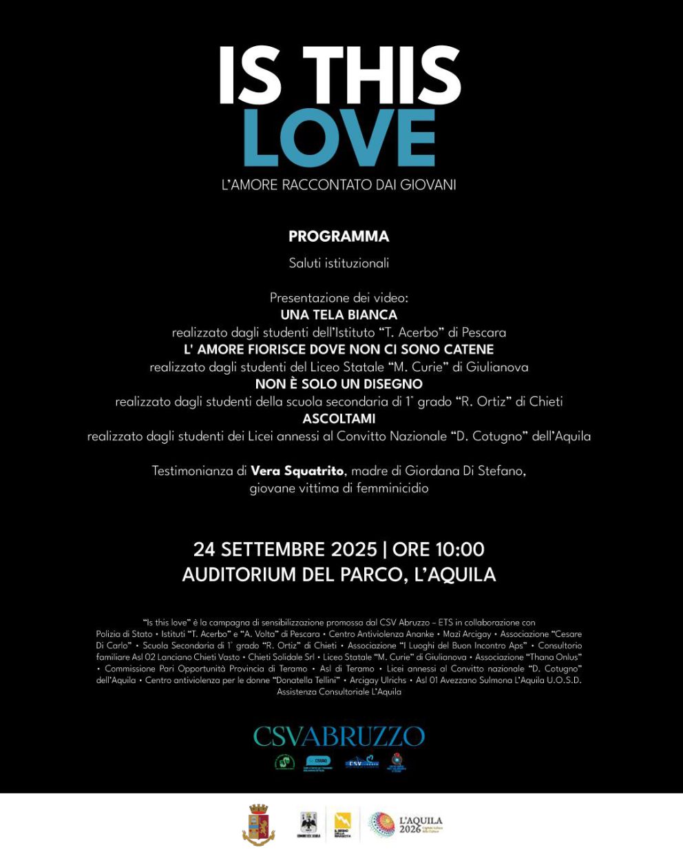 L’Aquila – 22 settembre 2025 – Mercoledì 24 settembre alle ore 10, presso l’Auditorium del Parco all’Aquila, si terrà il convegno “Is this love – L’amore raccontato dai giovani”, evento conclusivo del progetto Long Live Love! promosso dal Csv Abruzzo ETS. Al centro dell’iniziativa, l’educazione affettiva e la prevenzione della violenza di genere, raccontate direttamente dagli studenti di quattro istituti scolastici abruzzesi.