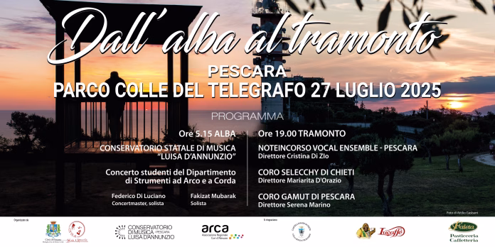 Domenica 27 luglio, il Colle del Telegrafo si trasformerà in un palcoscenico naturale per la nuova edizione della manifestazione musicale “Dall’alba al tramonto”, promossa dal Comune di Pescara con il sostegno dell’assessorato alla Cultura guidato da Maria Rita Carota e della presidenza del Consiglio comunale rappresentata da Gianni Santilli.