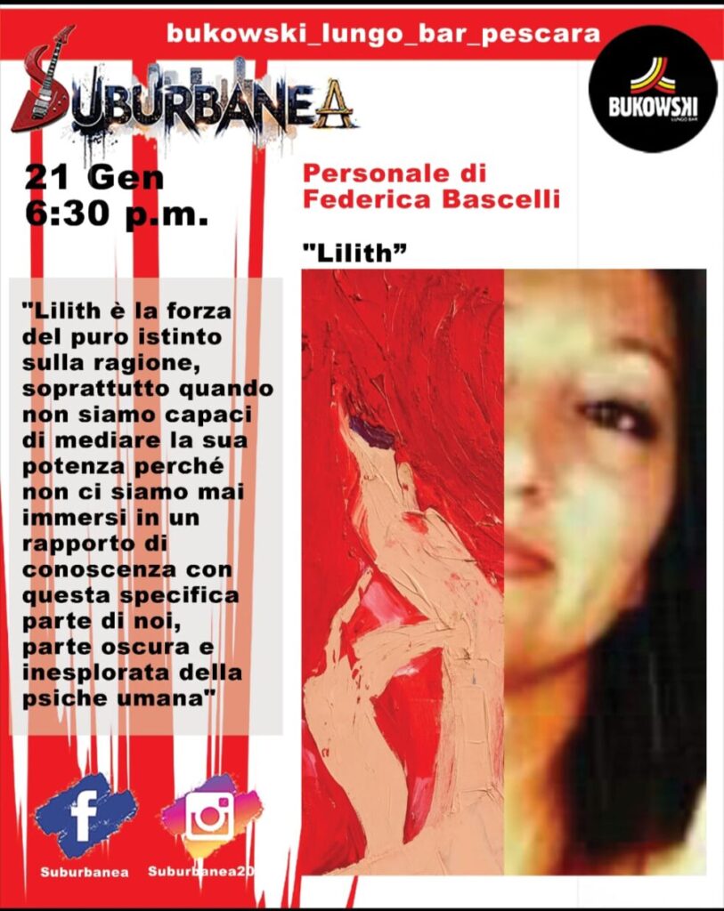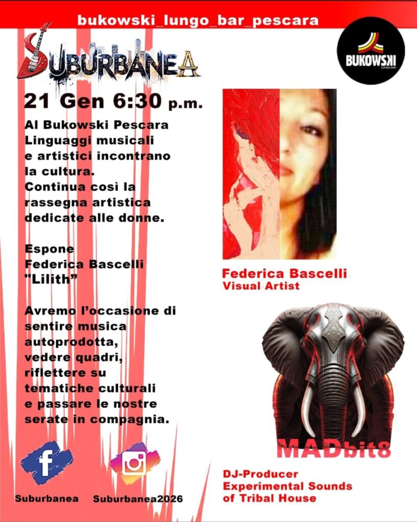 Pescara, 19 gennaio 2026 – Mercoledì 21 gennaio alle ore 18,30, il Bukowski Lungo Bar di Pescara ospiterà un nuovo appuntamento della rassegna “Suburbanea”, progetto culturale che intreccia linguaggi artistici e musicali con riflessioni sociali e identitarie. Protagonista della serata sarà l’artista Federica Bascelli, con la mostra personale “Lilith”, accompagnata dalle sonorità sperimentali di MADbit8.