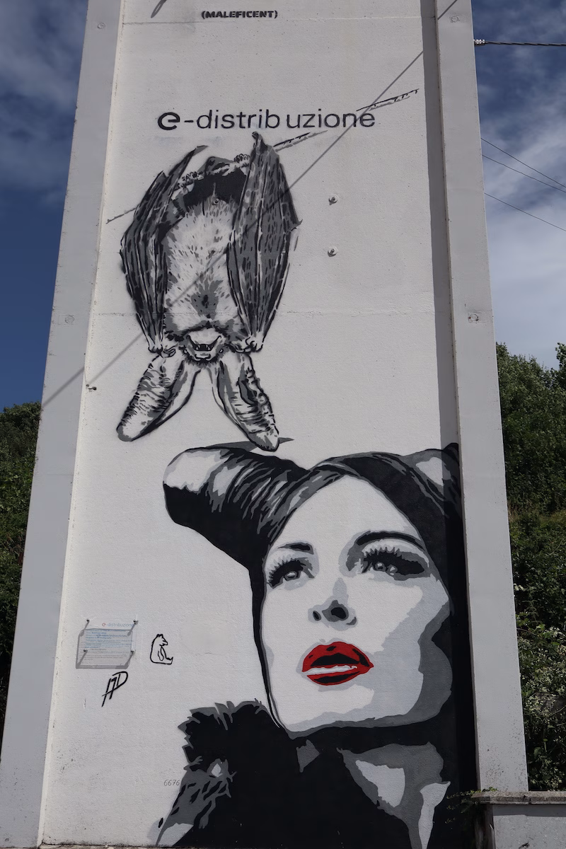 Tra le opere più suggestive, spicca quella dedicata a “Maleficent”, creata da Nicola D’Amico, in arte NICO: una rivisitazione della celebre fata, ritratta come protettrice del bosco e dei pipistrelli, con un forte messaggio ecologico. I murales prendono vita anche da fiabe iconiche come “Cappuccetto Rosso”, “Heidi”, “Biancaneve”, “Pocahontas” e “La Bella e la Bestia”, con figure femminili reinterpretate attraverso le fotomanipolazioni delle artiste NV Photographer (Nadia Novelli e Vittoria Barban).