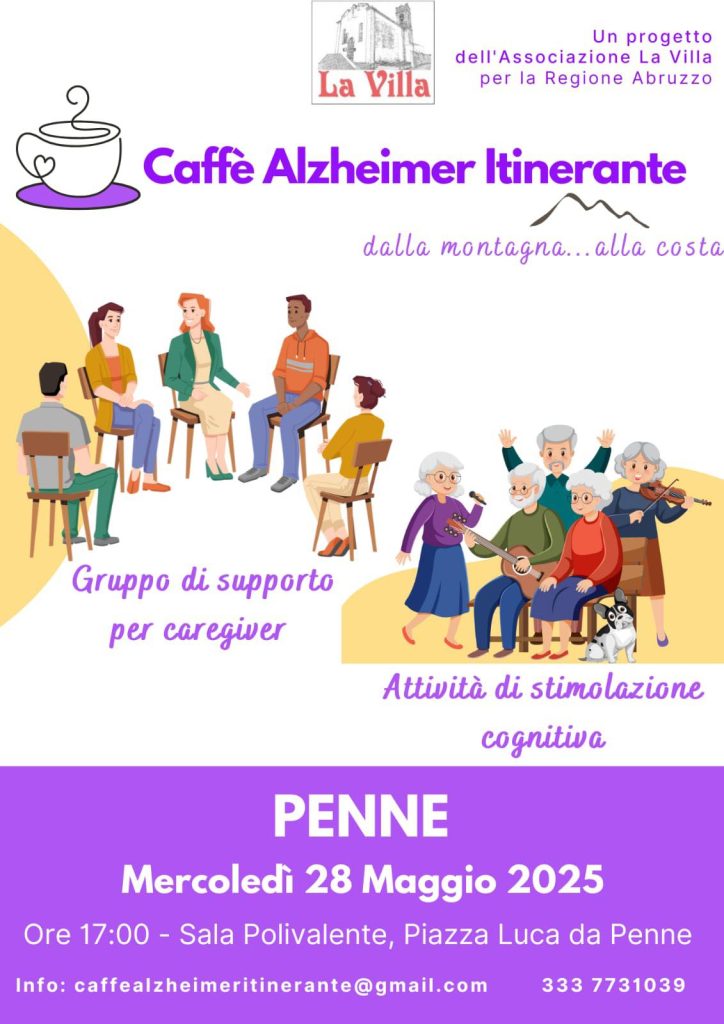 Il Caffè Alzheimer Itinerante, progetto promosso dall’Associazione La Villa per la Regione Abruzzo, farà tappa a Penne mercoledì 28 maggio 2025, alle ore 17:00, presso la Sala Polivalente.