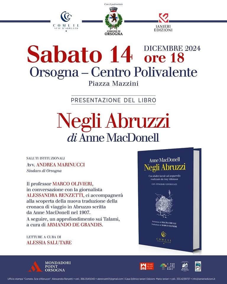 Sabato 14 dicembre alle ore 18.00 presso il Centro Polivalente di Orsogna (Ch) a piazza Mazzini, ci sarà la prima presentazione del nuovo volume della collana blu dedicata alla narrativa di viaggio per “Comete. Scie d’Abruzzo” della Ianieri Edizioni: si tratta di “Negli Abruzzi” di Anne MacDonell, ed il volume è stato curato dal Professor Marco Olivieri, con prefazione di Maura Chiulli.