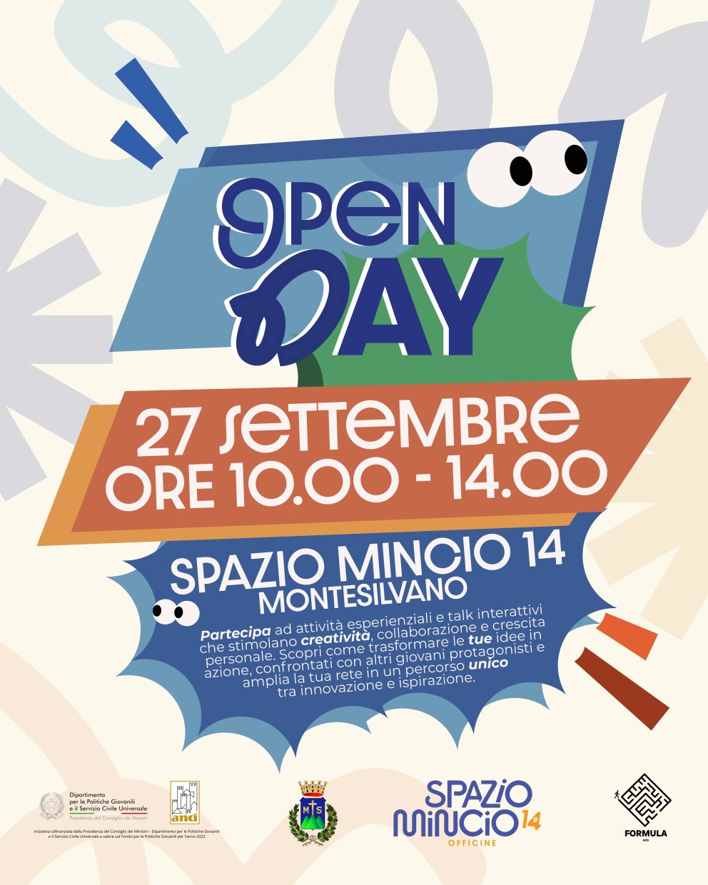 Montesilvano, 24 settembre 2025 – Sabato 27 settembre, dalle 10:00 alle 17:30, Spazio Mincio 14 invita i giovani under 35 a partecipare all’Open Day del nuovo hub giovanile di innovazione sociale, nato in un bene confiscato alla criminalità e restituito alla comunità. Un’occasione per conoscere da vicino servizi e attività pensati per la crescita personale e professionale delle nuove generazioni.