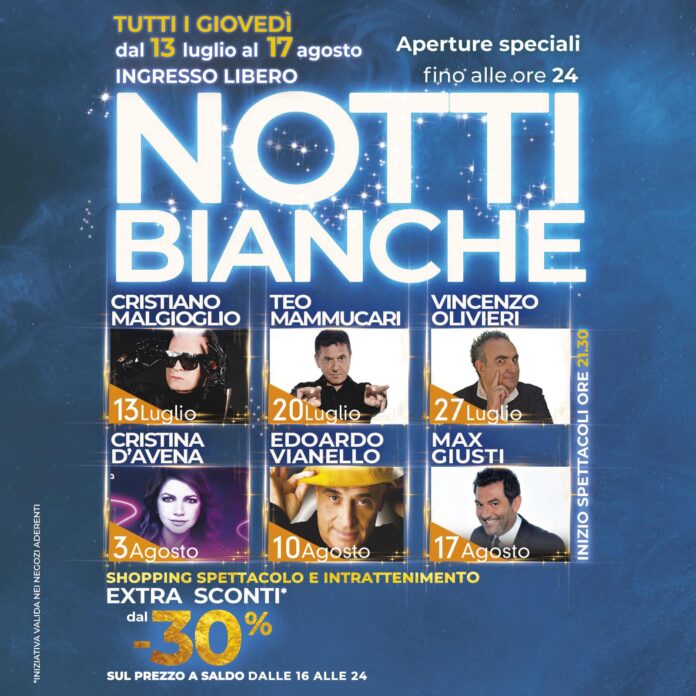 Fare shopping sarà ancora più conveniente e divertente, grazie a sei imperdibili appuntamenti con altrettanti artisti tra i più noti della scena nazionale, che sapranno intrattenere la clientela con allegria, musica e comicità. Al Città Sant’Angelo Village Outlet ce n’è davvero per tutti i gusti e per tutta la famiglia: il divertimento è garantito e lo shopping pure, con le Notti Bianche, che ogni giovedì dal 13 luglio al 17 agosto accompagneranno l’estate e gli extra sconti a partire dal – 30% sui prezzi a saldo, dalle 16:00 alle 24:00, nei negozi aderenti.