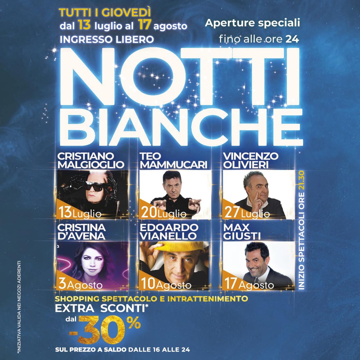 Un’estate da sogno al Città Sant’Angelo Village Outlet. Nel corso della stagione, a partire dal 13 luglio fino al 17 agosto 2023, ogni giovedì, ci saranno le NOTTI BIANCHE. Saranno sei gli appuntamenti all’Outlet di Città Sant’Angelo, con ingresso libero e inizio fissato alle ore 21:30,  che daranno la possibilità ai visitatori di fare shopping e di godersi gli spettacoli, con negozi aperti fino alle 24:00. Il ricco programma, quindi, prevede: