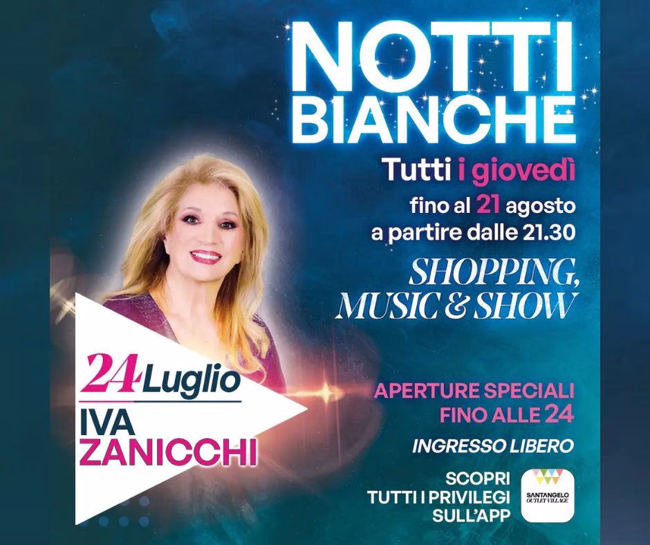 CITTÀ SANT’ANGELO – Dopo il debutto travolgente con Max Giusti, tornano le serate più attese dell’estate al Santangelo Outlet Village: le Notti Bianche, un’esperienza che coniuga musica, spettacolo e shopping sotto le stelle.
