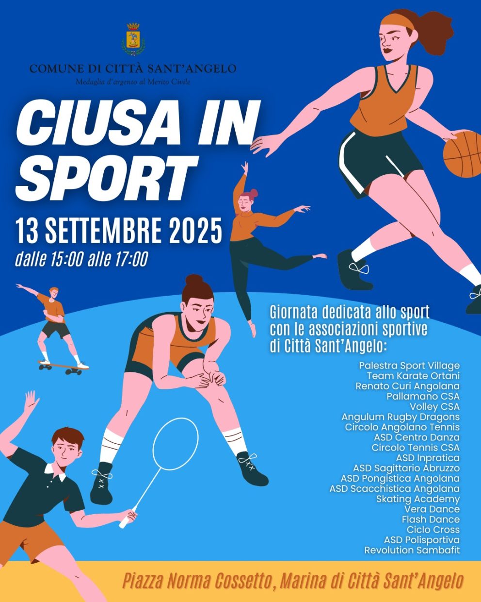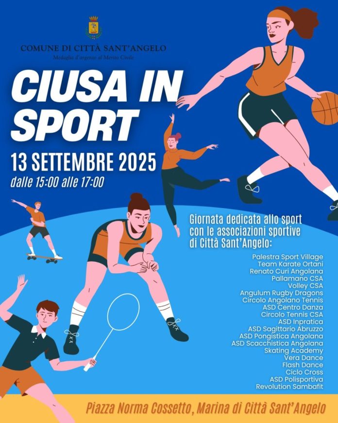 CITTÀ SANT’ANGELO – Sabato 13 settembre torna Ciusa in Sport, la tradizionale festa delle associazioni sportive di Città Sant’Angelo, giunta all’edizione 2025. Quest’anno l’evento si sposta alla Marina, tra via Salara e piazza Norma Cossetto, trasformando il lungomare in un grande villaggio dello sport all’aperto.