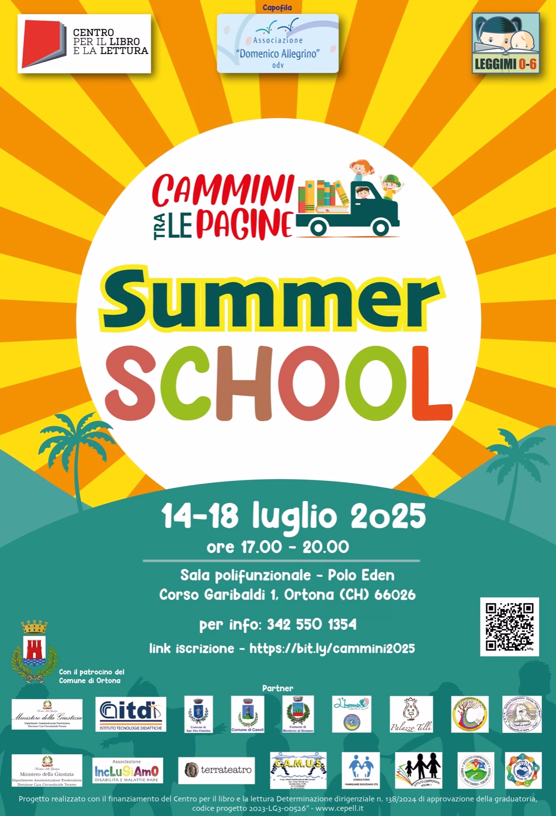 Ortona, 9 luglio 2025 – Dal 14 al 18 luglio 2025, la città di Ortona ospiterà la Summer School “Cammini tra le pagine”, un ciclo di cinque giornate di formazione gratuita dedicato alla promozione della lettura nella prima infanzia. L’iniziativa, patrocinata dal Comune di Ortona, è parte del progetto nazionale “Cammini tra le pagine”, realizzato dall’associazione Domenico Allegrino Odv di Pescara con il finanziamento del Centro per il libro e la lettura (Cepell).