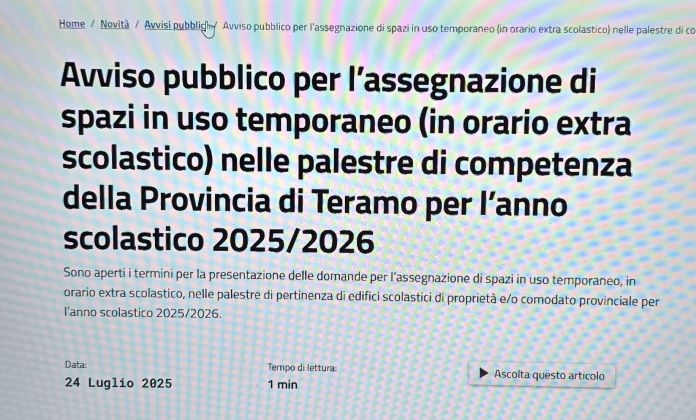 Teramo, 25 luglio 2025 – La Provincia di Teramo ha pubblicato il bando per l’assegnazione degli spazi sportivi in orario extrascolastico presso gli istituti superiori di sua proprietà, per l’anno scolastico 2025-2026. L’iniziativa conferma e amplia l’impegno dell’Ente verso la valorizzazione delle strutture scolastiche a beneficio del territorio e delle realtà sportive locali. Gli istituti coinvolti salgono a 18, un numero record rispetto agli anni precedenti.