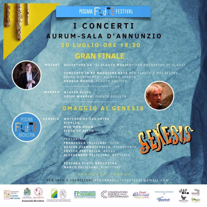 A caratterizzare il concerto finale sarà una formazione inconsueta: il direttore della Pescara Flute Orchestra, Marco Felicioni, sarà affiancato da Francesca Felicioni (voce) e Alessandro Felicioni (batteria), in un’esibizione che unisce talenti familiari in una proposta musicale articolata e originale.