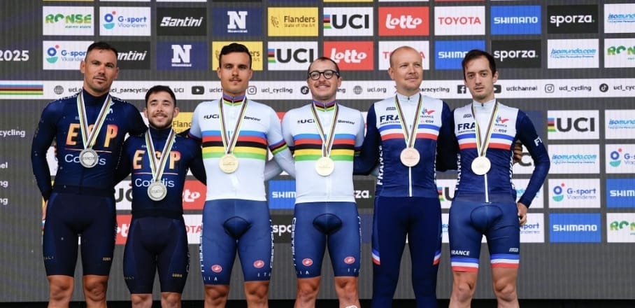 L’Italia del paraciclismo torna sul gradino più alto del podio mondiale a distanza di 11 anni. A Ronse, in Belgio, Federico Andreoli e l’abruzzese Francesco Di Felice hanno conquistato l’oro nella prova in linea del tandem maschile, riportando la maglia iridata nel ciclismo paralimpico italiano.